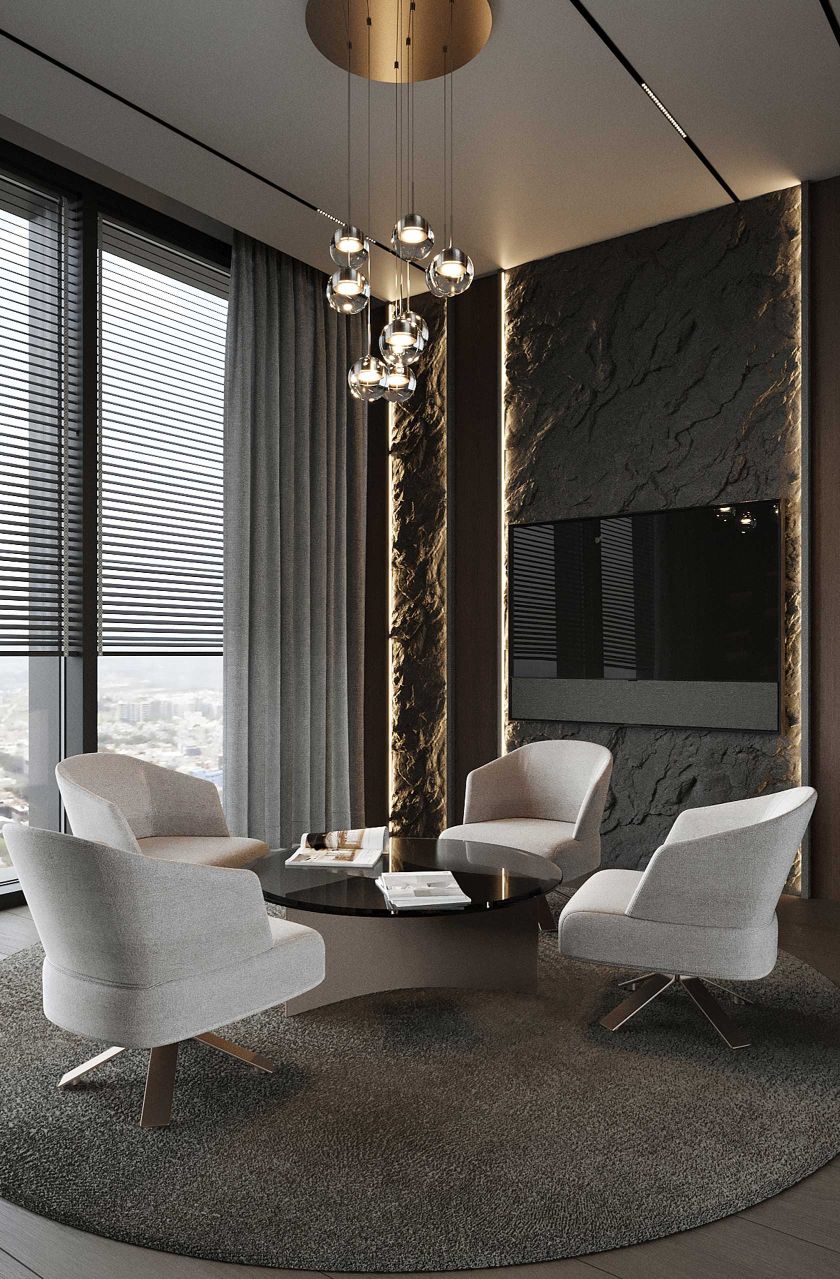 The plush seating arrangement, crafted from the finest materials, invites you to sink in and unwind in style. The room is adorned with intricate decorative details, from the elegant chandelier hanging overhead to the stunning artwork adorning the walls. The cutting-edge entertainment system, discreetly integrated into the sleek design, provides the ultimate in-home cinematic experience. As you relax in this opulent setting, you are enveloped in a sense of glamour and refinement that is simply magnificent.